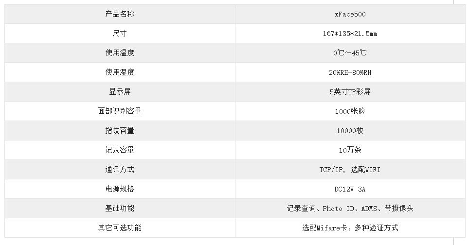xFace500采用Linux操作系统,具有指纹验证、人脸识别等多种验证方式,签到多种选择,轻松考勤;中英文输入法,轻松编写。标配Wiegand in/out,具有门磁、报警等多种功能,保证工作安全,是您时间管理全新的选择
